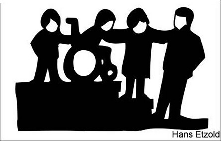 "Das Kind wird nicht erst Mensch, es ist schon einer." (Janusz Korczak). Alle Menschen haben eine Würde, sind gleichwertig, auch wenn sie auf unterschiedlichen Stufen der Entwicklung sind. Das Kind mit Behinderung und das Geschwisterkind stehen auf einer Stufe, sind gleich viel wert. (Umsetzung des Künstlers H. E. mit Geschwisterkindern)
